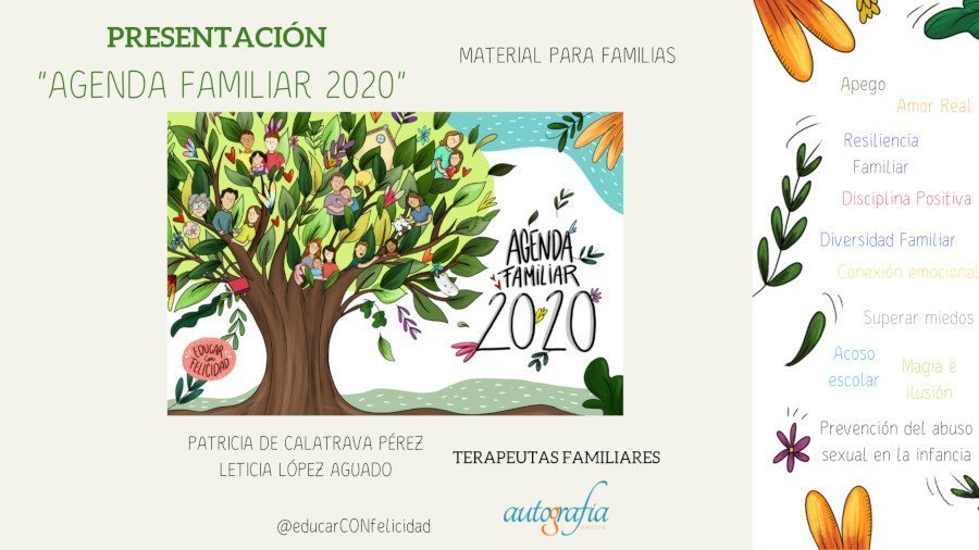 Se trata de una agenda anual para el 2020, creada por dos terapeutas familiares, con contenidos educativos y psicológicos destinada a familias en general. Cada mes desarrolla un tema (apego, resiliencia familiar, acoso escolar, disciplina positiva, diversidad familiar, prevención del abuso sexual en la infancia...) desarrollado en un artículo, diferentes post semanales y una herramienta reflexiva y de autoconocimiento.